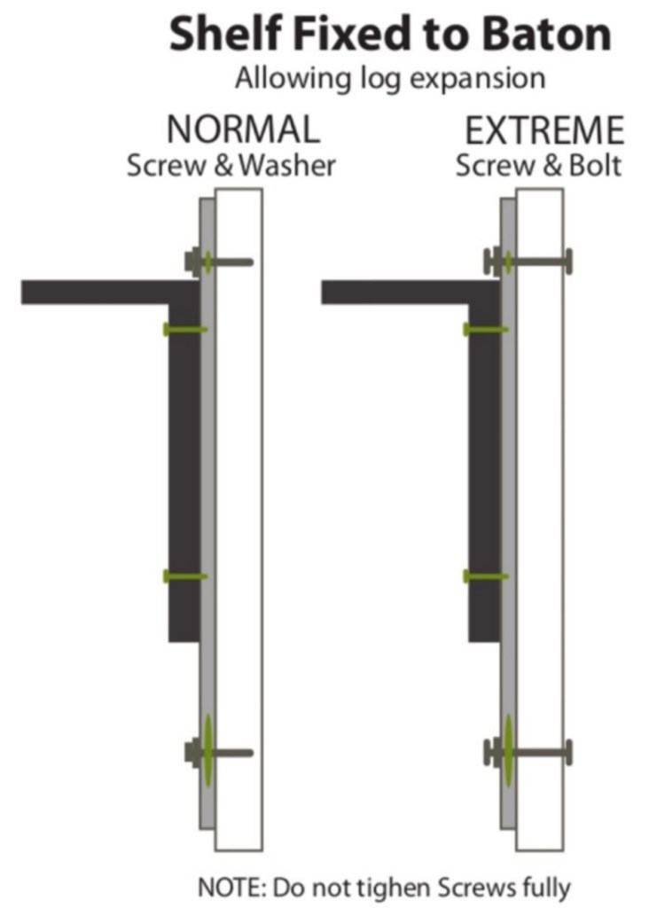 You will see from the diagram (Figure 2) that we are fixing the shelves to the expansion slot and not to the logs. For heavier duty uses you may want a thicker slat and you may want to bolt it fully through the timber building wall.