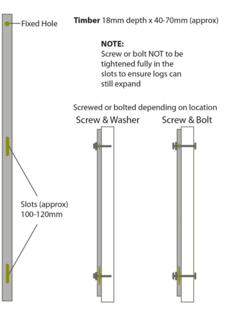 The very simple principle here is that we have one fixed hole at the top and slots in the middle and end (depending on the length). The top hole is screwed tight and using a washer the slot fixings are not tightened fully so allowing the logs to move behind the bracket. (See Figure 1)